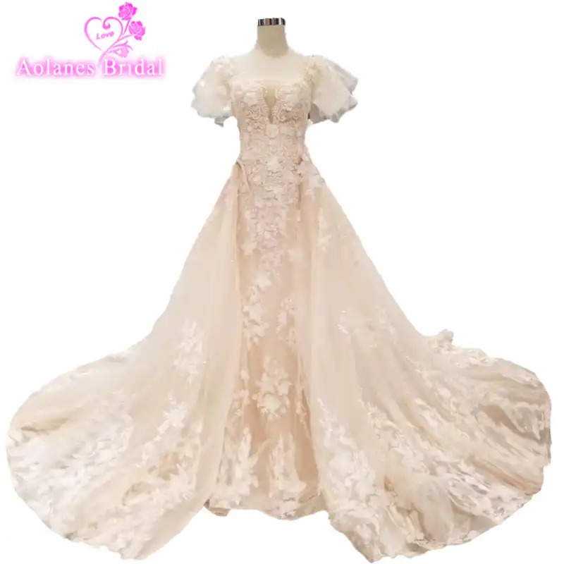 2019 Champagne Pink Lace Long Sleeves Mermaid Wedding Dress With Detachable Train 3d Flowers Appliques Overskirt Bridal Gowns Wedding Dresses Aliexpress from ae01.alicdn.com